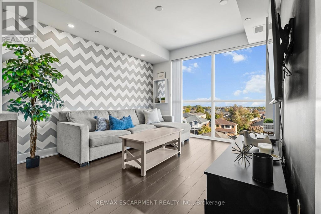 Welcome to Link Condos, ideally situated in one of Burlington's most sought-after neighbourhoods. You will love this bright and spacious 1 BR + Den unit; originally a builder model with all the bells and whistles, including built-in stainless steel appliances. A large kitchen island with quartz countertops, stunning dark hardwood flooring throughout, potlights and upgraded tile in the bathroom. The open balcony has unobstructed south/west views of Lake Ontario and the Niagara Escarpment with no one directly above, adding to the private feel, and gives tons of natural sunlight in the unit and for the exterior living space. Trails and parks at your doorstep, including amazing schools, shopping, public transit, and easy highway access. Tons of visitor parking and one owned space in the secured underground lot. An ideal location for young professionals, or if you're looking to downsize but don't want to compromise on location. The amenities include 24/7 concierge, a full gym, plus sauna, steamroom, plunge tubs, games room, and party room with full kitchen and common courtyard with BBQ. (id:6289)