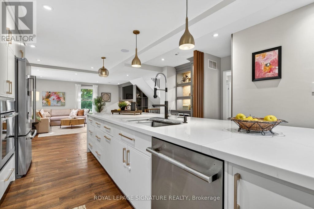 Your dream family home awaits! All the upgrades & finishes you need, all that's left is to move in. This home offers an incredible layout: 3+1 bdrms, 3 full baths, main floor powder rm, sunroom, 2-car garage, open-concept living & kitchen, spacious bsmt & an entertainer's backyard. Perfect for everyday living or hosting; from cozy family nights to large gatherings. The stunning kitchen, fully reno'd in 2023, boasts high-end JennAir smart appliances, 6-burner gas stove, ultra-quiet rangehood & dishwasher, toe-kick lighting & massive island w/ built-in storage. Upstairs, the primary suite offers a gorgeous reno'd 4-pc ensuite, while 2 additional bdrms share another reno'd 4-pc bath. Convenient second-flr laundry adds ease to daily life. Bsmt complete w/ soundproofed office, flexible multipurpose rm (playrm, gym, or extra bdrm), & furnace rm w/ ample storage. Luxury upgrades incl motion-activated closet lighting, smart switches (2024), in-ceiling speakers (Alexa compatible), smart fireplace, smart window AC in sunrm & Wi-Fi sprinkler system (2025). Enjoy summers in your private backyard w/ landscape lighting, new mechanized patio awning & space for entertaining. Additional updates: newer furnace (2022), finished garage w/ new garage doors (2024), pot lights, storage & finished walls (2025). Driveway & garage fit 4 cars. Ideally located: 7 mins to Clarkson GO (non-stop trains to Union), 3 mins to Maple Grove Plaza (groceries, pharmacy, shops), 3 mins to YMCA daycare & lakeside, plus only 2-min walk to creek. In highly desirable SE Oakville, you're also close to schools w/ French Immersion & Advanced Placement programs, parks, trails, vibrant waterfront, QEW access & Oakville GO. Don't miss this chance to make this beautiful home your family's next chapter! More Features of Note: central vacuum on all floors, premium Karndean vinyl flooring throughout (scratch-resistant & low-maintenance), commercial-grade external blower rangehood for odourless & ultra-quiet cooking. (id:6289)