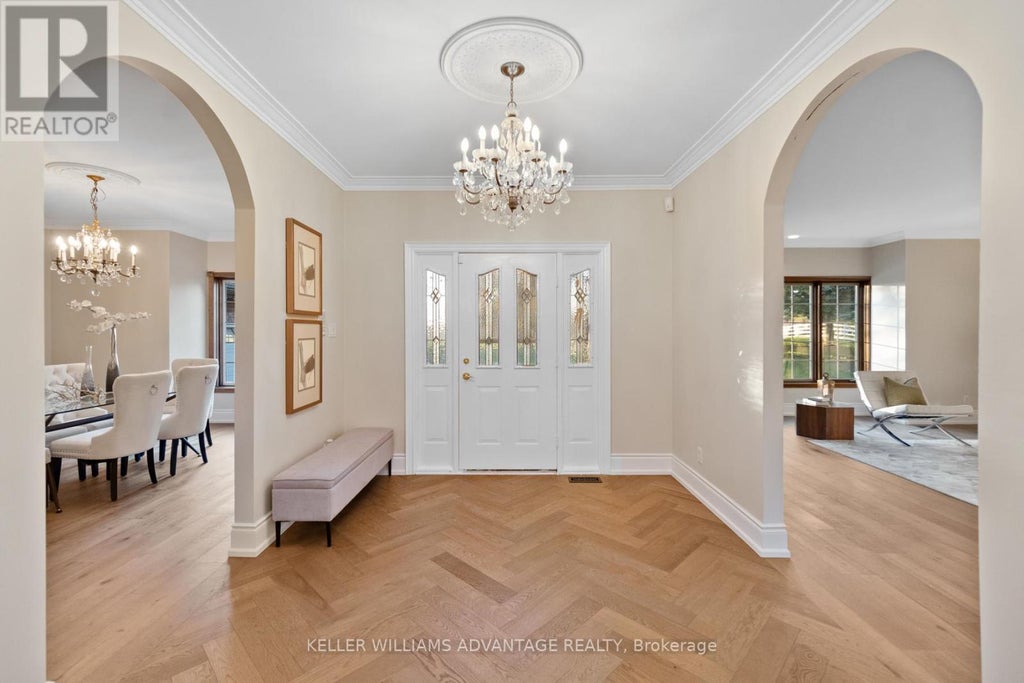 Set on 7.5 acres of picturesque countryside, this impressive 7,325 sq ft estate combines timeless elegance with modern comfort. Spread across two expansive levels, the home features engineered oak hardwood floors, a stunning herringbone foyer, grand arched entryways, and freshly painted interiors throughout. Upgrades include new bathroom countertops, sinks, and stylish hardware finishes for a contemporary touch. With 9-foot ceilings on both levels, the open-concept layout offers exceptional versatility-featuring 6 bedrooms, 6 bathrooms, 2 full kitchens, and 2 laundry rooms. The fully finished walkout basement is its own self-contained living space with a private kitchen, laundry, and multiple separate entrances-ideal for rental income, multigenerational living, or an in-law suite. Designed for those who love indoor-outdoor living, the home offers multiple walkouts leading to a wraparound deck overlooking the grounds. The property also includes a 24' x 40' outbuilding (ideal for shop/garage space), three storage sheds, a charming gazebo, and a peaceful pond complete with a paddleboat. A perfect blend of sophistication and rural tranquillity-your private retreat awaits. (id:6289)