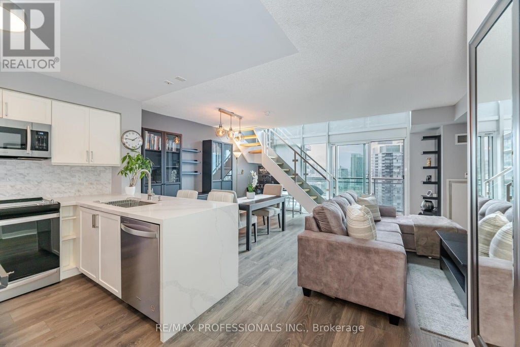 Absolutely gorgeous and spacious 2 story loft filled with an abundance of light through the floor to ceiling windows and breathtaking waterfront views! Enjoy this beautifully laid out open concept unit in fabulous building and highly desired location in the heart of Mimico close to all amenities. This stunning unit has been upgraded with a beautifully renovated kitchen with quartz countertops, breakfast bar, backsplash, upgraded stainless steel appliances, and laminate flooring. Relax in the spacious second floor retreat with large bedroom and additional den/office and ample closet space as well as luxurious master ensuite. Enjoy the stunning views from the spacious balcony of the lake and city. 1 Parking space included. Amazing resort style amenities in the building including concierge, fitness center, outdoor pool, rooftop deck, bike storage, community bbq, games room, guest suites, media room, party room, sauna, and squash court. Fantastic location close to highways, waterfront, trails, stores, groceries, Mimico Go, Parklawn Go and transit. Don't miss out on this fabulous suite! (id:6289)