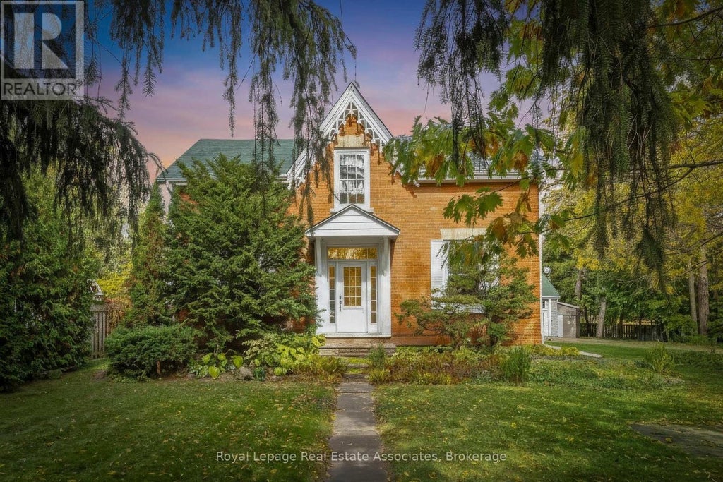 This is one remarkable property - perfect for a family based home business, or perhaps future development. Two lots, one with the dwelling, drive shed (home office), with a deeded right of way to the lane behind the property, and a severed building lot (50.1 x 110). **These lots must be sold together**. Zoned Low Density 1 allowing for home occupation, and is in the Georgetown Go Train Secondary Plan Review. The larger, irregularly shaped lot, with maintained century home, updated throughout the years, is a cozy well loved home with a renovated kitchen and dining room with large windows and gas fireplace, welcoming bright living room with gas fireplace, a bright and sunny den, and a main floor bedroom with sitting area (which could be used for any purpose) with an semi-ensuite bathroom. The second floor has three bedrooms and a renovated bathroom with laundry. Outside you'll find a large gathering sized deck, and perennial gardens. The detached coach house is partially finished as a home office (approx. 24.5 feet x 12 ft) complete with gas fireplace to heat and an air conditioner unit. High ceilings and transom window make this work space inviting. Find two detached storage sheds, and two attached to the coach house on the side and back. The building lot, takes up the driveway and extends slightly into the parking area. (id:6289)
