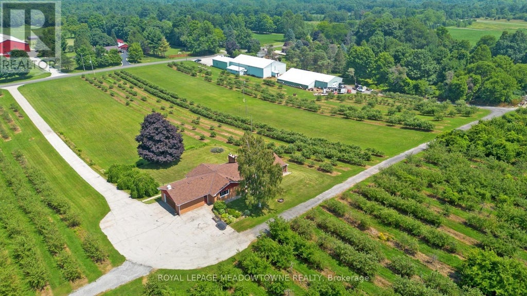 Welcome to 1453 Milburough Line - an extraordinary countryside estate set on 37.68 gently rolling acres in one of Carlisle's most desirable and emerging rural communities. Located on a quiet paved dead-end road, this rare property offers exceptional exposure and access to the vibrant agri-tourism activity of the area. A destination for cyclists, tourists, and day-trippers from Toronto and U.S. border, this scenic setting supports both lifestyle and income-generating uses. 28 +/- acres planted apple orchard with 8+/- acres for vegetables, sunflowers, lavender, hops or other specialty crops. The fully licensed cidery, distillery & retail space, plus a sprawling 3+2 bedroom raised bungalow perched on a hill with panoramic views of the countryside and orchard. Ideal for multigenerational living, staff housing, or as a rental income opportunity, the residence offers 3,700+ SF of finished space. The main level is carpet-free with hardwood and tile flooring, and features a spacious eat-in kitchen with walk-out, formal dining & living rooms with a wood-burning fireplace. The principal includes a private 3-pc ensuite. Updated windows, pot lights, central air, central vacuum, and a forced air furnace (2021) provide modern comfort. The finished basement offers 2 additional bedrooms & bathroom with above-grade windows, an office, and a walkout to an enclosed hot tub room perfect for extended family or guest/farm help accommodation. The attached 2 car garage adds to the convenience, while recent shingles (2023) enhance peace of mind. The fully licensed cidery, distillery, retail & storage with 15-ft ceilings, shipping, washrooms & ample paved parking. The distillery has cold storage plus more insulated, heated space with drive-in doors for a wide range of permitted uses. Bell Fibre, liquor licenses, wholesale & retail network, make this a multi-purpose investment. Live, work and grow all in one place while also having the flexibility to support income or farming-related uses. (id:6289)