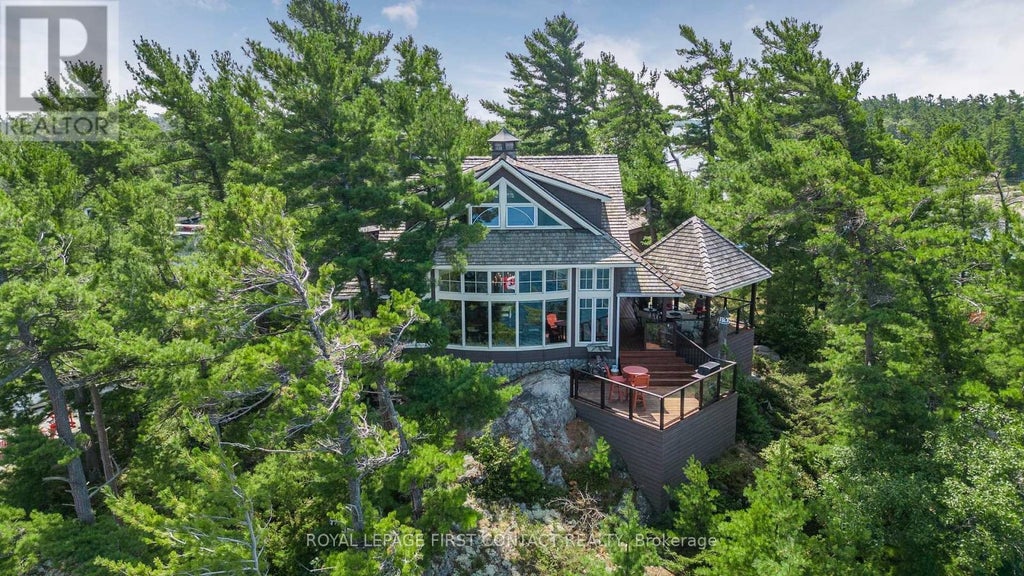 Welcome to your private paradise a pristine 1.42 acre island sanctuary called Lumsden Island in the heart of Sans Souci. This exclusive turn-key property offers a seamless blend of natural beauty & modern luxury, featuring a custom-designed 2,800 sq. ft. main 3 bedroom cottage, a charming two-bedroom guest cottage, and an adorable bunkie that sleeps 4. Nestled amidst the islands natural splendor, the main cottage is a stunning fusion of wood, glass, and stone, designed to harmonize with its surroundings. Enjoy 360 degrees of waterfront from the attached covered gazebo or bask in the sun on 1 of 2 expansive decks aptly named the 'Sunrise Deck' and 'Sunset Deck' both featuring glass railings that provide uninterrupted, panoramic views of the surrounding water. It is so rare to enjoy both a sunrise and sunset on such a private retreat. Step inside to a breathtaking open-concept great room, bathed in natural light from windows on three sides, offering unparalleled views of the bay. The room is crowned by a unique half-round vaulted ceiling with ambient backlighting, creating an inviting atmosphere for gatherings/entertaining. The kitchen is a chefs dream, equipped with custom cabinetry, luxurious granite counters, and island. High-end appliances include a Wolf range, stainless fridge/freezer, wine fridge, and dishwasher, all complemented by a wine storage rack & dual sinks for effortless meal prep. Dine in style beneath a towering 1.5-storey bay window, where a handcrafted dining table, made from reclaimed Cape Cod wood, seats ten. After dinner, relax in the family room by the large granite fireplace, crafted from stone sourced directly from the island, for a true touch of authenticity. There are 2 premier docks w/multi-slip deep water and can even accommodate larger boats w/50 amp power for your boating friends to visit. Sit back and relax around a granite stoned patio w/firepit. This is more than a property; it's an unparalleled lifestyle opportunity you can't miss. (id:6289)