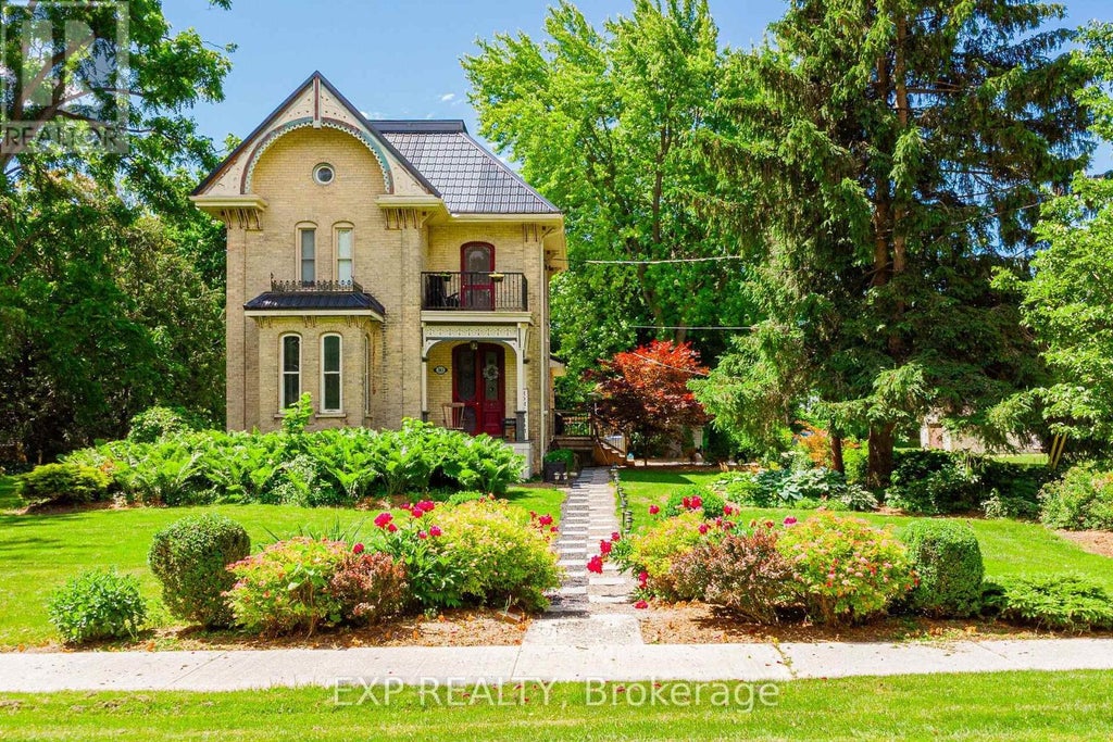 Welcome to 283 Hastings St in Parkhill, ON! Experience a breathtaking blend of historic charm and modern luxury in this 1890 Victorian masterpiece. Thoughtfully updated while preserving its rich character, every inch of this home showcases timeless craftsmanship, from the striking metal roof to the intricate architectural details. Inside, soaring ceilings, intricate crown mouldings, and beautifully restoredVictorian trim create an unforgettable first impression. The grand foyer, featuring original front doors with stained-glass windows and an impressive wooden staircase, sets a tone of elegance and warmth. Designed for both everyday living and unforgettable entertaining, the bright sitting room flows effortlessly into a spacious formal dining room. The kitchen is a true showstopper, flooded with natural light from a skylight and featuring a charming breakfast nook and an expansive butlers pantry complete with a farmhouse double sink, second fridge, and dishwasher. The living room is a true retreat, with a cathedral ceiling, grand fireplace, and French doors that open onto a sprawling 1,000+ sq. ft. deck, perfect for dining under the stars or morning coffee in the sun. The main floor bathroom offers a luxurious nod to Victorian elegance with custom cabinetry, granite countertops, and a stunning black tile and marble mosaic shower.Upstairs, three generously sized bedrooms and a beautifully designed four-piece bathroom complete with a tiled shower, custom vanity, and modern clawfoot soaker tub create a serene escape. A sunlit reading nook, leading to a restored Juliette balcony, provides a perfect spot to unwind with a good book and a glass of wine. The partly finished basement adds even more living space, offering a large family room with fireplace, a dedicated workshop, a wine cellar, and plenty of storage. Set on a picturesque 0.59-acre lot, this property is ready to welcome you home! Note: some interior photos are virtually staged and are labeled as such. (id:6289)