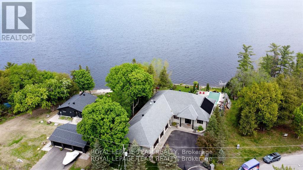 This stunning 5 bedroom, 3 bathroom waterfront home is truly one of a kind. Enter into the foyer and immediately be taken away by the breath taking views of the hills across the stunning waterfront. The foyer opens up to the spectacular living room featuring a fireplace, 2 skylights and 2 large sliding doors leading out to the screened in deck. This grand living room is open to the eat-in kitchen featuring stainless steel appliance, built in wine racks, ample cupboard space and an addition sliding door leading out to the massive deck. On the main level you will also find the incredibly spacious primary bedroom featuring a walk-in closet, 4 piece ensuite, fireplace and additional sliding doors leading out to the deck. This is the perfect couples retreat in your very own home. On the lower level you will find a centrally built wet bar and home theatre, perfect for entertaining, along with addition sitting space, 4 bright bedrooms and a 6 piece bathroom. The 1800 sqft heated garage with high ceilings offers ample storage space and opportunity for car lifts. The most notable part of this one of a kind home is by far the outdoor space. Not only is the screened in deck, massive uncovered deck, and large yard a wonderful space to enjoy all to yourselves or host guests, but the in-ground infinity pool and sandy shore line is every outdoor lovers dream. Enjoy a day of boating on the Ottawa River from your very own private dock. The spectacular waterfront offers prime views of sunrise and sunset all summer long and year round sunsets that are truly remarkable. No detail was missed inside or out in the design of this stunning property. (id:6289)