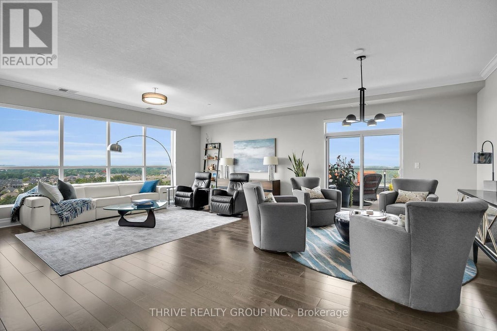 Welcome to this exquisite penthouse in the heart of Sunningdale, a rare offering in one of the London's most prestigious high-rise buildings. Spanning 2,140 sq. ft., this 2-bedroom + den residence boasts soaring ceilings, a formal dining room, and a bright, open-concept layout perfect for both everyday living and upscale entertaining. The spacious great room features a fireplace and seamlessly connects to the gourmet kitchen, complete with an island, stone countertops, and premium finishes. The luxurious primary suite includes a generous walk-in closet and a spa-inspired ensuite bath. Enjoy breathtaking, unobstructed North and East views from your expansive outdoor living spaces including a covered balcony (90 sq. ft) and a private 486 sq. ft. terrace ideal for entertaining or relaxing in total privacy. The building offers a full suite of luxury amenities, including an indoor pool, fitness centre, golf simulator, theatre room, and a residents kitchen and formal dining room for hosting private events. Additional highlights include two underground parking spaces (#54 and #33) and three storage lockers (#132, #141, and #153). This is a rare opportunity to own a signature penthouse with unmatched outdoor space and five-star amenities in one of Londons most desirable communities. (id:6289)
