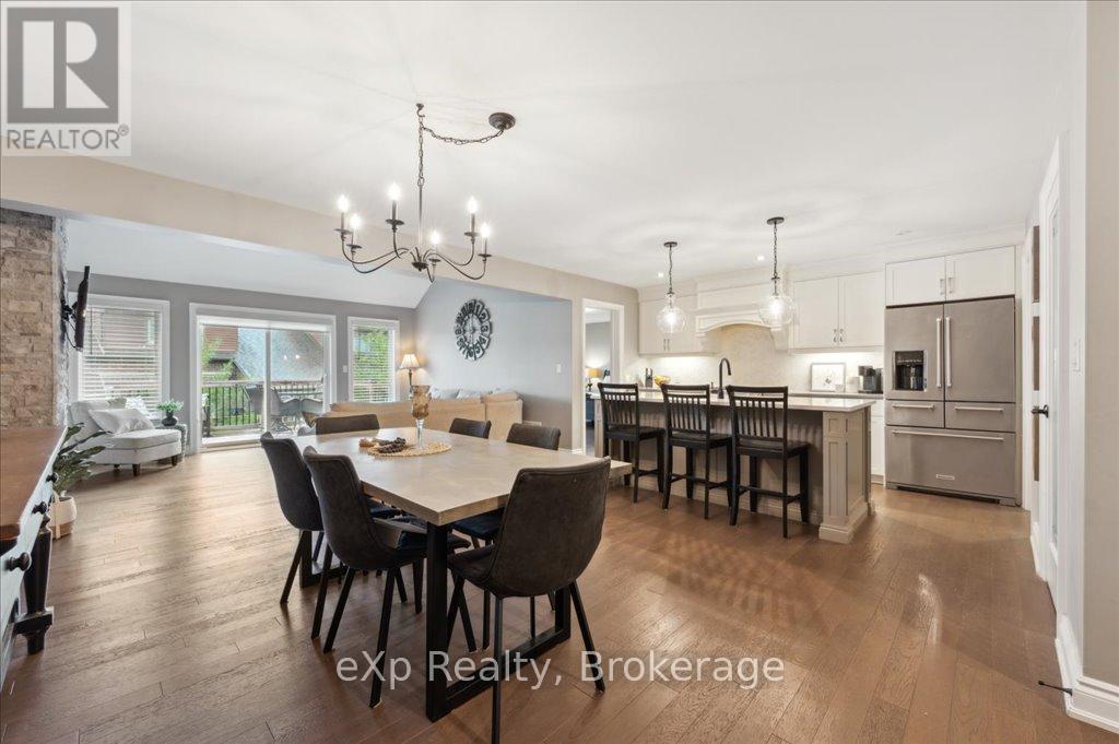 A stunning bungaloft with double car garage and finished basement, built by Charleston Homes. Over 3600 square feet of living space provides tremendous value at this price point. The main floor consists of a beautifully equipped kitchen with stone counters, custom cabinetry, an island with a sink, Stainless Steel appliances, updated lighting, pot lights and a walk-in pantry; living room with a soaring vaulted ceiling and fireplace with stone surround that anchors the room and a formal dining room, all with hardwood flooring. The primary bedroom is on this main level with hardwood floors, large ensuite with jacuzzi tub, walk-in shower with glass doors, and a walk-in closet. There are also some very nice stone accents around the tub and vanity. To complete this level, you will love the convenience of the mudroom and laundry room from the garage entry. The loft has a versatile office or family room with new carpet, two bedrooms with luxury vinyl flooring, and a 4-piece bath. Downstairs is finished with a large family room, a fourth bedroom, gym/workout area, plus plenty of additional storage. The high-end updates continue down here with large windows, 9 ft ceilings, 6 baseboards, pot lights, and laminate flooring. The interior layout is sure to please any type of family at any stage of life! Outside, you have your own rear deck and common area to enjoy and a private front porch but zero maintenance as the low condo fees cover all summer landscaping and snow removal from your driveway up to your front door! This location is ideal for a slightly smaller town feel, but a short and scenic drive to Guelph, Halton, and Mississauga regions. (id:6289)