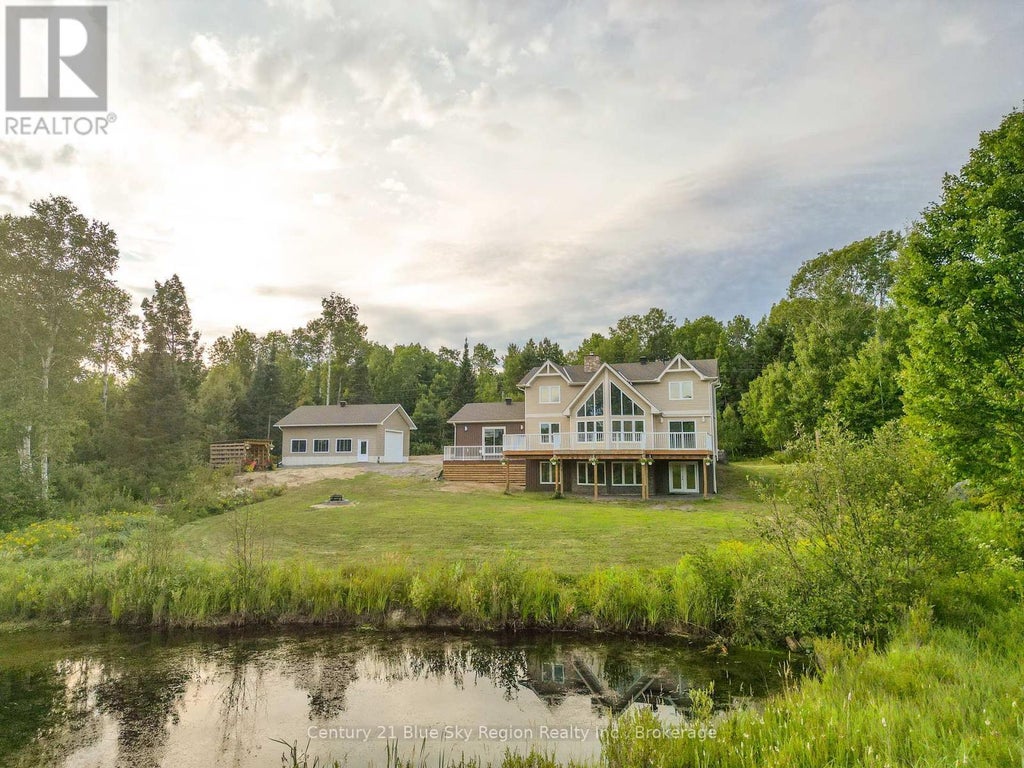 Experience refined country living in this stunning executive home with 12.99 acres, built in 2006 with exceptional attention to detail and premium finishes throughout. The heart of the home features a soaring two-storey stone fireplace, thermostatically controlled and vented to the central heating system, ensuring warmth is evenly distributed across every room. The gourmet kitchen impresses with high-end cabinetry, soft-close drawers, new countertops, and elegant crown molding. From the cathedral windows in the living room or from the bright family room below you'll enjoy breathtaking views of the property's sprawling acreage. Step out from the dining room onto a spacious deck, or take advantage of the walk-out basement for seamless indoor-outdoor living. Offering 3+1 bedrooms and 3.5 bathrooms, this home provides ample space for family or guests. The fully finished lower level includes a private bedroom, a 3-piece bath, a full kitchen, and direct walk-out access ideal for in-law suite capability or income potential . Additional highlights include a 22' x 24 'attached garage as well as a 30'x30' detached garage with 12 foot ceilings. Updates include furnace (2020), central air conditioning (2021), roof (2023), kitchens x 2 (2025). (id:6289)