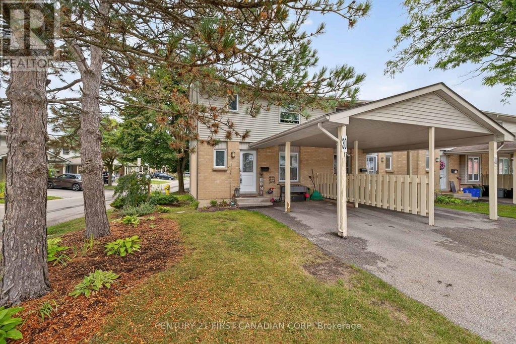 Welcome to 55 Ashley Crescent, Unit 30 a bright and spacious corner townhouse nestled in the desirable White Oaks neighborhood. This well-maintained 3-bedroom, 1.5-bath home features gleaming hardwood floors on the main level, stylish tile in wet areas, and a modern, updated kitchen perfect for everyday living and entertaining. Upstairs, you'll find brand-new carpeting and generously sized bedrooms filled with natural light. The partially finished basement offers a cozy rec room, ideal for a home office, playroom, or extra living space. Enjoy year-round comfort with central heating and A/C, plus the privacy of a fully fenced backyard. Additional perks include low condo fees, a covered carport, and parking for a second vehicle. Conveniently located just minutes from Highway 401, great schools, White Oaks Mall & other great shopping options, and well as all essential amenities. An ideal opportunity for families, first-time buyers, or anyone seeking a move-in-ready home in a fantastic location! (id:6289)