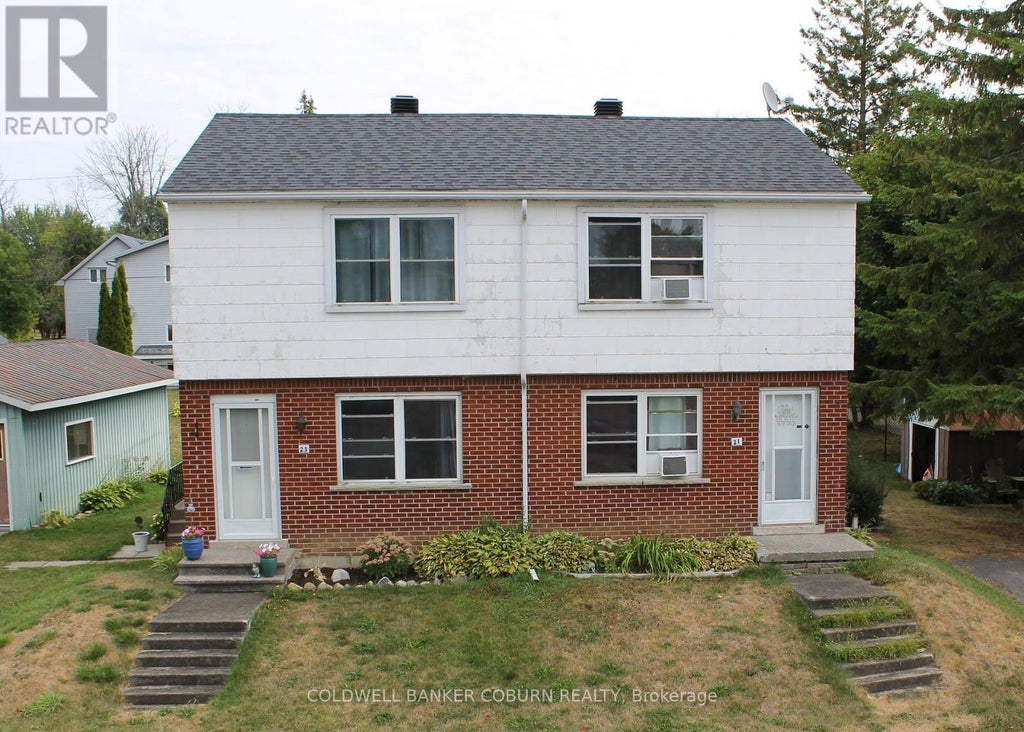 Two-Unit Property on Quiet Cul-de-Sac - Ideal for Investors or First-Time Buyers. This property features two semi-detached units within one building, each offering a practical layout and convenient location. Situated on a quiet, tree-lined cul-de-sac near the St. Lawrence River, these two semi-detached homes are within walking or biking distance of shopping, banks, restaurants, parks, a swimming beach, boat launch and dock, medical and dental clinics, curling club, arena, library, and the Upper Canada Playhouse. Each unit is a mirror image of the other, consisting of two bedrooms and one bathroom. Both units include full basements with Gas Furnaces and Rental Gas Hot Water Heaters installed in 2018. Notable updates include: Windows updated in the 1990s; Roof shingles replaced in 2020; New electrical panels installed in 2016; Sewer laterals for both units done in 2020 and one of the bathrooms was renovated in 2024. The interiors feature hardwood flooring on both the main and upper levels, along with a solid hardwood staircase.This is an excellent opportunity for investors or first-time buyers looking to live in one unit while generating rental income from the other unit. Note: Room types, square footage, and dimensions listed are for one unit only. The property includes one garage, currently used by the north-side tenant. Interior photos are from 2017, when one of the units was vacant. (id:6289)
