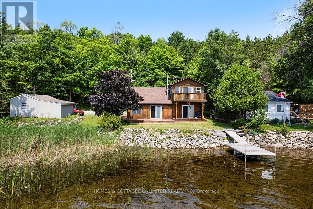 Nestled on the tranquil north shore of Dalhousie Lake, this well-maintained, partially furnished home or cottage is move-in ready just in time for summer memories. Featuring 3 spacious bedrooms (2 up, 1 down) and 2 full bathrooms, there's plenty of room for family and guests to relax in comfort. The oversized primary bedroom offers its own private balcony with stunning lake view perfect for morning coffee or quiet reflection. The open-concept main floor showcases a vaulted ceiling, warm pine flooring, and a cozy woodstove for those cooler evenings. The bright kitchen seamlessly connects to the dining and living areas, with patio doors leading to a generous lakeside deck ideal for entertaining or simply enjoying the peaceful surroundings. Convenience is key with a large main floor bath that includes laundry. The insulated garage/workshop features patio doors that open to the water's edge, offering versatile use of space. A charming bunkie tucked away at the back of the property provides a great guest hideaway or personal retreat. The shoreline is shallow with a solid bottom perfect for swimming and there's room to anchor your boat just offshore. Inside, natural light fills every room through abundant windows, creating a bright and cheerful atmosphere that brings the outdoors in. This delightful property is truly a pleasure to show full of charm, comfort, and lakeside appeal. Don't miss your chance to make it yours! (id:6289)