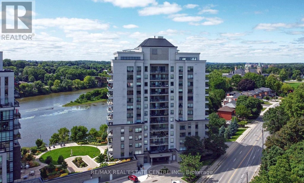 Heres one with something special: 266 square feet of outdoor living space. With a beautiful 19 x 14-foot balcony, theres plenty of room for your outdoor furnitureplus even a putting green! Its large enough to entertain and offers an incredible view of the river and walking trails. This corner unit features wraparound windows, making the open-concept layout bright and filled with beautiful views. Its spacious and includes a bonus room that could be used as an office, dining room, orwith a futon and room dividerguest accommodations. So many possibilities! Ideally located just steps from the scenic river walking trails, downtown Cambridge, the vibrant Gaslight District, and the iconic Cambridge Mill. Whether its a night out for a great meal, a theatre production, or a visit to the farmers' market, its all within walking distance. Imagine enjoying your morning coffee or evening nightcap with this view. This building offers underground parking, outdoor seating areas including a rooftop terrace, a party room for entertaining family, friends, or business associates, a gym, a guest suite you can reserve as needed, and a storage locker. This is the perfect home for anyone seeking a low-maintenance yet stylish lifestyle in one of Cambridges most desirable locations. (id:6289)