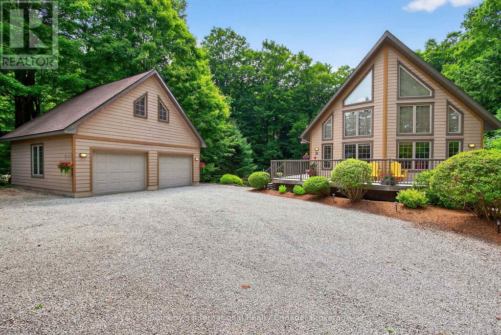 Welcome to 28 Big Tree Circle, a stunning, architecturally designed home offering over 2,500 square feet of finished living space, including a total of 4 bedrooms and 3 bathrooms. Tucked away on a private 1-acre lot in a peaceful forest setting, this exceptional property is ideally located just minutes from the Mansfield Ski Club, Mansfield Outdoor Centre, and a short walk to the Boyne River perfect for all-season recreation. Enjoy easy access to scenic hiking and biking trails, the charming village of Creemore, and the vibrant town of Collingwood. Inside, this beautifully crafted home features gleaming maple flooring, a granite and maple kitchen, and an impressive open-concept living, dining, and kitchen area highlighted by a dramatic wall of east-facing windows that flood the space with natural light and frame the surrounding forest. The thoughtfully designed layout includes a private second-floor primary bedroom retreat complete with a 4-piece ensuite, a cozy sitting area overlooking the main living space, and a private deck nestled among the treetops. The main floor offers flexibility with a bedroom or office and an adjacent 3-piece bathroom ideal for guests or remote work. The bright, fully finished, above-grade walk-out lower level features two additional spacious bedrooms, a 3-piece bath, a large games room with a pool table, a cozy TV area, and an inviting porch sitting area perfect for enjoying your morning coffee or unwinding in nature. A detached double car garage provides ample space for vehicles, toys, and storage, while the loft above offers a perfect bonus area for your hobbies, studio, home office, or additional storage. Whether you're looking for a weekend getaway or a full-time residence, this exceptional home offers a rare combination of natural beauty, modern comfort, and an unbeatable location just one hour from Toronto Pearson International Airport and the GTA. (id:6289)