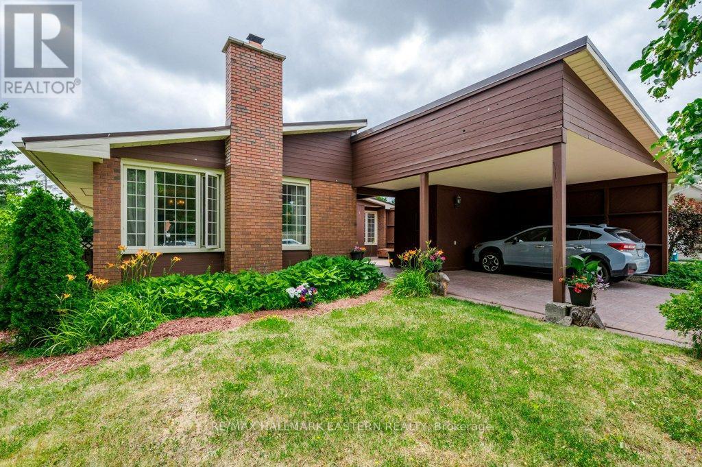 Room to grow and timeless appeal. This west-end gem is nestled in one of Peterborough's most family-friendly neighbourhoods. Spacious bungalow offering over 1,700 sq ft on the main floor and a layout designed for everyday comfort and easy entertaining. Step inside to find three well-sized bedrooms, including a primary suite with convenient access to a 5-piece bathroom. The bright and functional kitchen offers plenty of cupboard space, sleek quartz countertops, updated within the last 5 years and a cozy breakfast nook. Just off the kitchen, the open living and dining room with a wood-burning fireplace creates a welcoming space for hosting or relaxing. A standout feature of this home is the additional family room with cathedral ceilings, hardwood floors, and a gas fireplace make it a favorite gathering spot year-round. Sliding doors lead to a large back deck overlooking the fully fenced yard, perfect for summer BBQs and quiet mornings outdoors. The lower level adds even more living space with two extra bedrooms, a full bathroom, a recreation room, bonus flex room, and a large laundry/storage area. Outside, enjoy low-maintenance living with a stamped concrete driveway, metal roof, covered carport, and charming front courtyard. With schools, PRHC, and public transit just around the corner, this is a home that combines location, space, and lasting value. (id:6289)