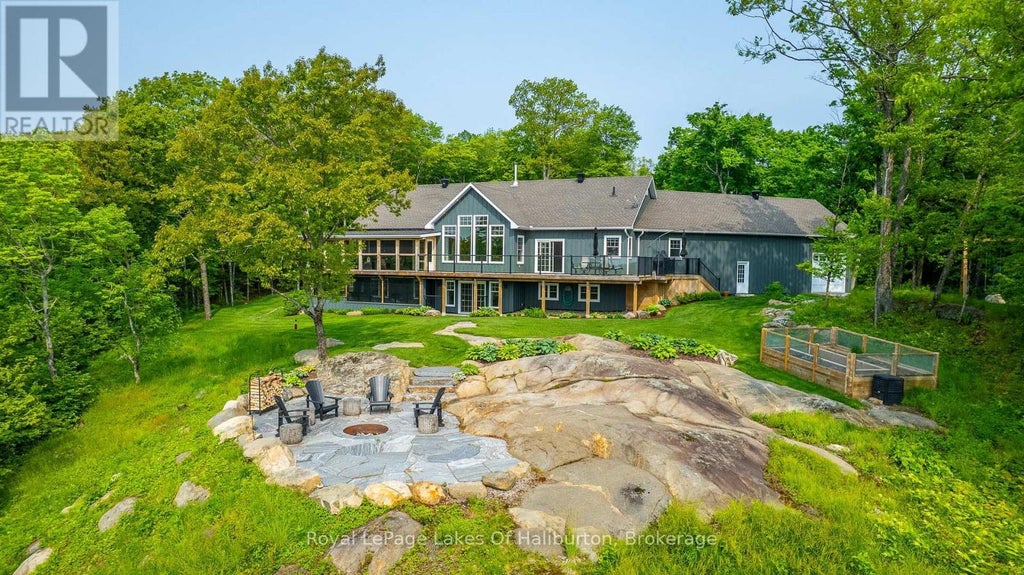 Experience refined lakeside living on the private shores of Loon Lake, where 800 feet of deep waterfront & over 5,000 sq ft of thoughtfully designed living space come together in perfect harmony. This extraordinary year-round meticulously maintained 3+2 bedroom residence is the epitome of peace and luxury, offering breathtaking panoramic views and unmatched privacy. At the heart of the outdoor experience is a stunning natural granite and stone firepit area with panoramic lake vistas. Enter through a dramatic timber-frame porch into the grand Great Room, where a floor-to-ceiling dry stack stone fireplace, engineered hardwood flooring and lots of windows invite the outdoors in. Step out onto the expansive 850+ sq ft deck with glass-panel railings, where sunrises and the tranquil lake horizon set the tone for each day.The kitchen is built for entertaining, stainless steel appliances, soft-close cabinetry & a corner sink with captivating views. The main-floor primary suite is a private sanctuary, complete with a ensuite with heated floors, a walk-in closet and direct access to a screened-in Haliburton Room, your serene space to unwind.The lower level extends the homes versatility with two more bedrms, games rm, heated floors, a second kitchen, 3-piece bath, and a cozy living area that opens to the hot tub room, stone flooring & stacking windows blend indoor comfort with natures beauty. Designed for accessibility and functionality, the home features, wide hallways, California shutters, & a spacious laundry room with heated floors & sink, generator & 200 amp. The heated triple garage includes a drive-through bay, electric openers,100-amp panel & 9ft doors. A separate 1,800 sq ft heated garage/workshop with 9-ft doors, 100 amp & a wood lean-to offers ample space for hobbies & storage,landscaped with dry stack stone walls, perennial gardens, & a generator backup system. On this 54 acre parcel you can hunt in your own backyard and access to an extensive ATV trail network. (id:6289)
