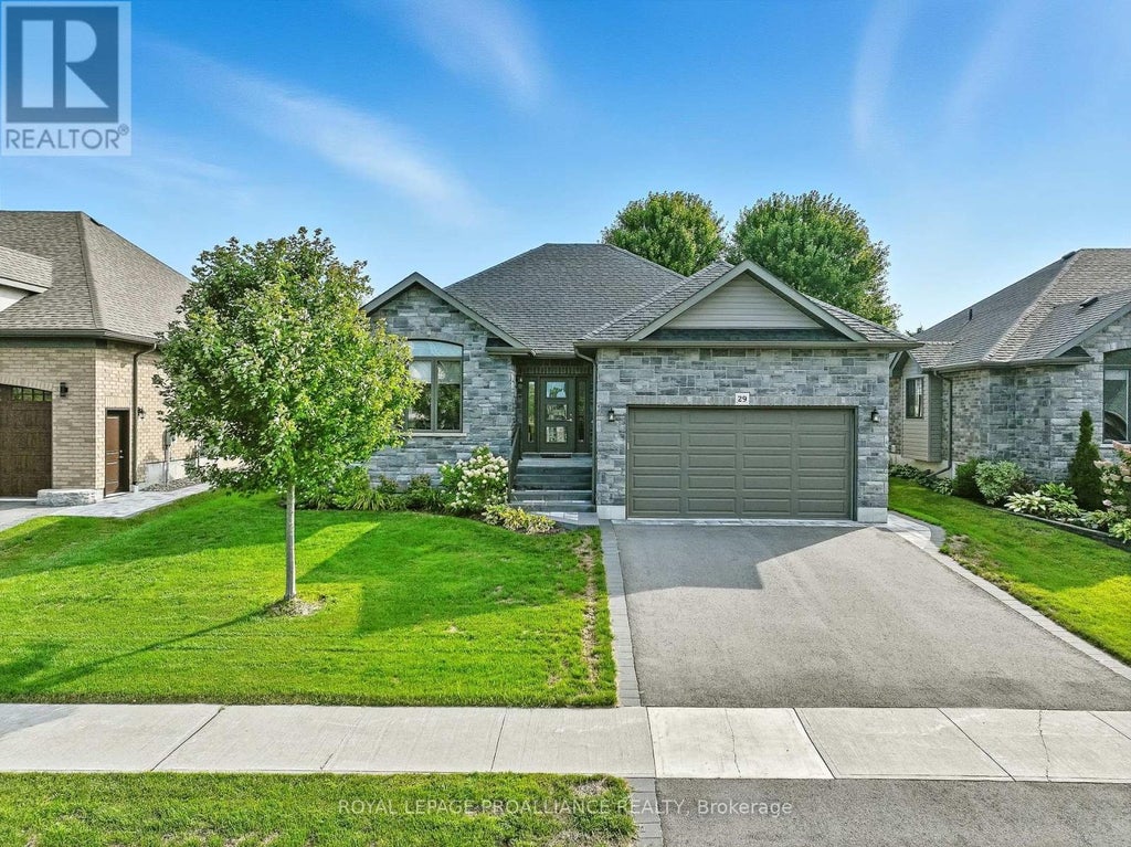 Welcome to 29 Rosslyn Street, perfectly situated in one of Brighton's most sought-after neighbourhoods on Rosslyn Drive. This desirable location backs onto Proctor Park Conservation Area, offering trails and natural beauty just steps away. Enjoy the walkability to downtown Brighton, where cafs, shopping, weekly summer Concerts in the Park and community amenities create a vibrant small-town lifestyle. This modern stone bungalow showcases 3 bedrooms and 2 bathrooms, with main floor living designed for comfort and ease. Inside, contemporary style and an open concept layout highlight the Great Room with its warm gas fireplace, perfect for cozy winter evenings. The gourmet kitchen is a showpiece with ceiling-height cabinetry, quartz countertops, stylish island, induction stove and newer appliances. The adjoining dining room opens through patio doors to your beautifully landscaped yard, making indoor-outdoor living seamless. Entertain effortlessly on the two-tiered wooden deck, an ideal space for summer barbecues, dining al fresco, or relaxing with friends. The spacious primary suite includes a walk-in closet and spa-like ensuite with a large glass-and-tile shower, bidet and modern finishes. Two additional bedrooms provide flexibility as guest rooms, a home office, or den. A convenient laundry room with laundry tub connects directly to the attached garage, adding everyday practicality. The lower level is ready to be finished, offering the potential for two more bedrooms, a full bathroom (roughed-in) and a generous recreation room, an excellent option for growing families or hosting visitors. Brighton offers all amenities and active lifestyle opportunities with a Rec Centre, Curling Club, Summer concerts, Tennis & Pickleball Courts, YMCA & so much more! With thoughtful design, upscale finishes, and room to expand, this home is ideal for both retirees seeking one-level living and families needing extra space. 29 Rosslyn Drive is more than a home, its a lifestyle! (id:6289)
