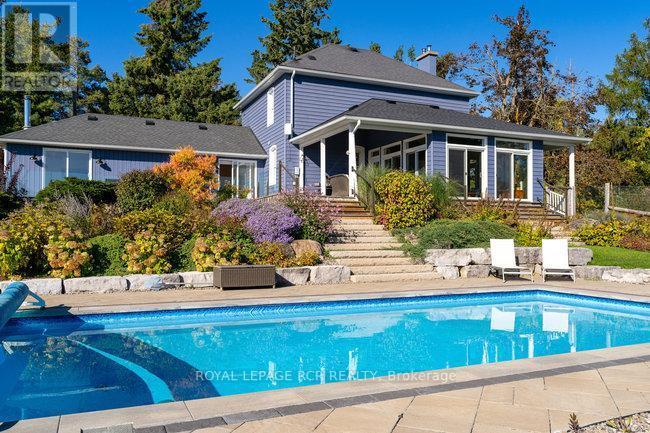 Set on 25 picturesque acres with sweeping views of the Mulmur Hills, this beautifully maintained century farmhouse offers the perfect blend of character and modern comfort. Inside, the home features a spacious open-concept kitchen and family room, ideal for gathering and entertaining, while still showcasing the warm character of its farmhouse roots and taking in panoramic views to the east and south. Large windows invite in natural light and frame the stunning countryside backdrop throughout. Upstairs features beautiful pine floors, laundry, and generous bedrooms. Step outside to enjoy the serene landscape, lush gardens, a sparkling inground pool, and expansive grounds that provide both privacy and endless opportunities to explore with an extensive trail system. The renovated drive shed works as pool house and extra storage space but could also be a fantastic workshop or hang out space. Whether you're looking for a peaceful escape, a place to host family and friends, or simply a connection to nature, this property delivers it all. A rare offering, this home captures the essence of country living with the convenience of being just a short drive to nearby Creemore, Mad River Golf, and both Devil's Glen and Mansfield Ski Clubs. (id:6289)
