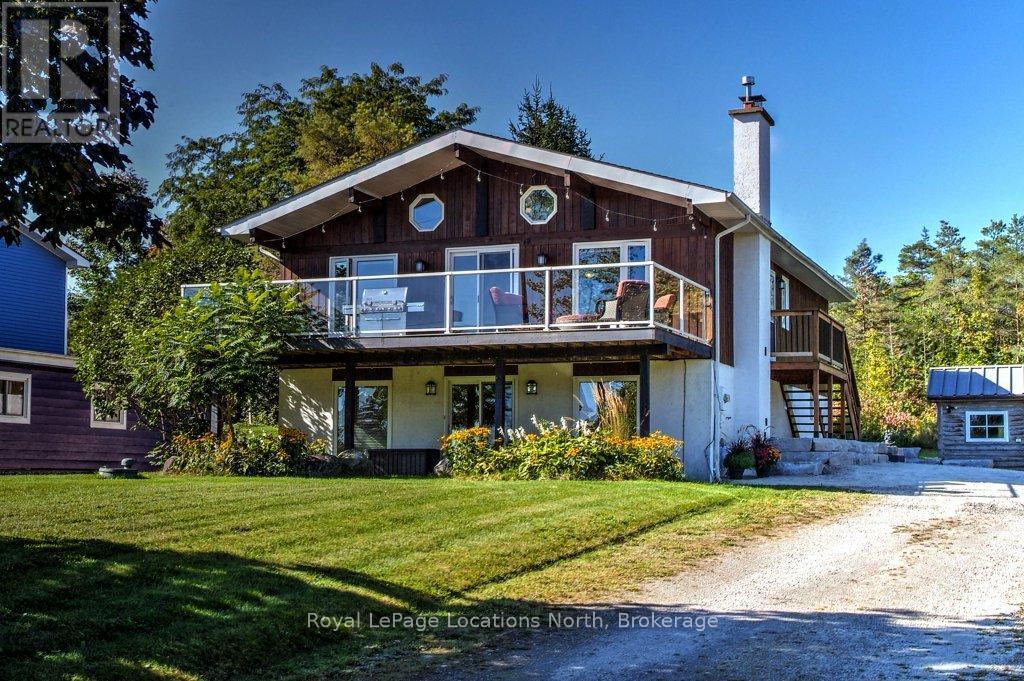 Poised on a gently sloping lot, this captivating chalet style, four-bedroom, two-bathroom home is filled with natural light and partial views of Georgian Bay and water access across the street. Some of the most attractive highlights of this home include the cathedral ceiling in the main living area, the floor to ceiling stone fireplace and the walk out to the generous sized deck. The main floor boasts hardwood floors, a renovated semi-ensuite bathroom, walk out to the back deck and two great sized bedrooms. The open concept living area is a joy to spend time in whether it's cooking on the gas stove in the kitchen, entertaining or reading a book by the fire. On the lower level you will be pleasantly surprised with the walk out family room with gas fireplace and full window wall, two additional bedrooms, a large and bright laundry/storage room and a 3-piece bathroom. Step outside to the large yard space at the rear of the house, original cabin which would make a terrific studio or play space if you opted not to use it as a shed. New furnace 2024. New exterior stone retaining wall and stone steps 2025. New water heater 2023. Living area furniture negotiable. The location of this home positions you on the edge of town, near all amenities, shops and restaurants in Meaford while providing you the cottage feel with Georgian Bay right across the street. Grab a picnic and stroll down to St Vincent Park on the shore. (id:6289)