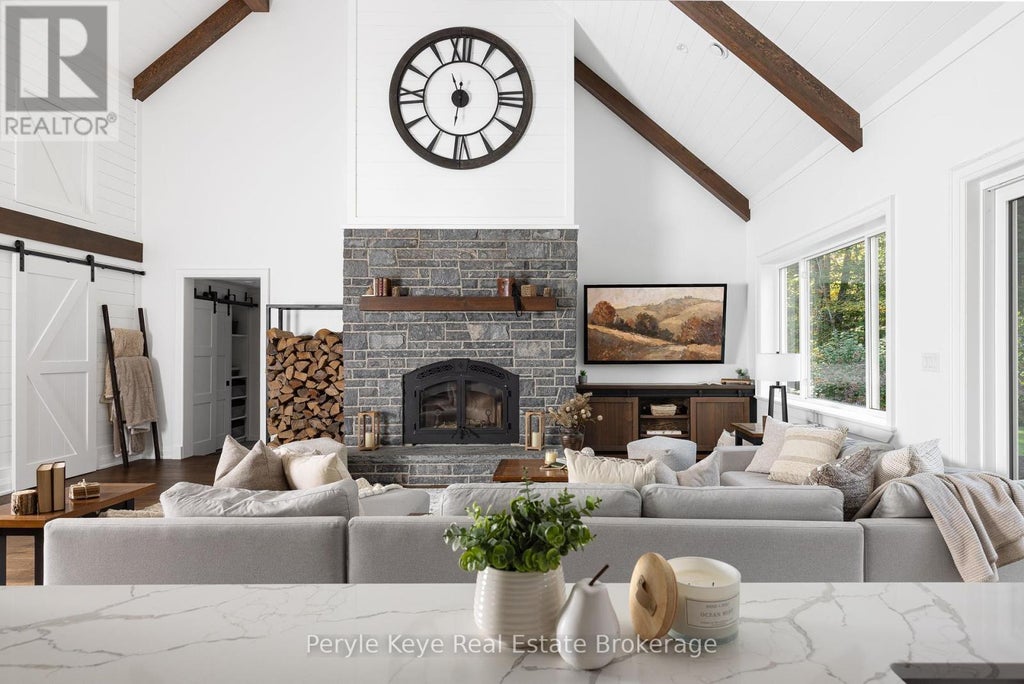 Every story starts with a setting. This one is set where craftsmanship, comfort, and quiet Muskoka living converge on a beautifully landscaped acre of land. Tucked into an upscale community just south of Gravenhurst and 1.5 km to HWY 11, this custom built 2022 bungaloft offers around 2600 sq ft of refined living space with a floor plan designed to function beautifully for both everyday living and weekend entertaining. From the moment you arrive, you're welcomed by award-winning perennial gardens, granite walkways, and landscape lighting that sets the tone. Inside, soaring 18-foot vaulted ceilings and a sun-filled, open-concept layout create an airy, inviting atmosphere and a wood-burning fireplace brings cozy warmth to those cooler days. The kitchen will make you excited to host family gatherings. Anchored by a large island, outfitted with high-end appliances and custom cabinetry designed to handle everything from weekday meals to holiday dinners. Radiant in-floor heating runs throughout the main house, even in the garage. And beneath the surface, a full mechanical setup features on-demand hot water, water treatment systems, and backup heat sources. Plus, a whole-home automatic generator ensures peace of mind year-round. A Muskoka room with floor to ceiling screens and constructed with timber framing invites you to unwind after hours, while soundproof insulation throughout the home ensures every space feels restful. Outdoors, irrigation covers the full yard and gardens, and stone pathways guide you to a fire pit patio under the stars. This home reflects quality in every surface, crafted with intention and maintained with pride. Your life is full of stories, and every story starts with a setting. (id:6289)