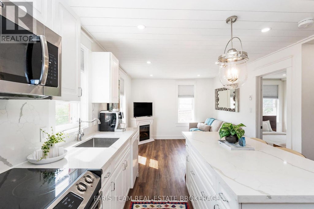 Top 5 Reasons You Will Love This Condo: 1) Beautifully updated corner-unit condo with sun-soaked South-East views, including glimpses of Georgian Bay, nestled in Meaford's charming and historic Blue Water building 2) Ideal for those seeking a relaxed, affordable lifestyle just steps from sandy beaches, local restaurants, shops, and year-round entertainment 3) Thoughtful upgrades include modern kitchen countertops and appliances, a refreshed bathroom with a glass walk-in shower, and an owned hot water tank for peace of mind 4) The functional open-concept layout features a spacious kitchen with a large island, a cozy living area with an electric fireplace, and a bright bedroom accented by shiplap ceilings and sleek recessed lighting 5) Enjoy the convenience of easy access to parking, storage lockers, and shared laundry, all within a building that offers character and charm. 454 above grade sq.ft. (id:6289)