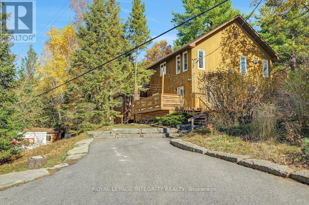 Tucked into the natural landscape of the Canadian Shield, this one-of-a-kind home offers the perfect balance of peace, privacy, and proximity to recreation. Nestled on a 1.24-acre double lot beside Mount Pakenham, this 3-bedroom, 1.5-bath home feels like a modern ski-lodge retreat. Surrounded by mature pines, boulders, and trails leading to a cozy fire pit, it offers serenity in every season - just 30 minutes from Ottawa. The open-concept main living area on the second level showcases the surrounding landscape, with large windows framing treetop views. The bright kitchen features newer stainless steel appliances (2023), and the adjoining dining area with a fireplace (propane) sets the tone for family meals and gatherings. This level also includes a full bathroom. The main level offers a welcoming foyer, three bedrooms, a powder room, laundry room, and a versatile layout-with the newest bedroom addition (2025) enhancing the home's functionality and charm. The newly completed office (2024) is fully insulated and soundproofed-ideal for remote work-with a large window bringing in natural light. Updates include pot lights throughout (2021-2025), a custom tile shower (2023), pine ceiling and bulkheads in the second bedroom (2023), and more. The primary bedroom, part of a thoughtful addition, offers a quiet retreat with expansive windows and peaceful forest views-an inviting space that reflects the home's tranquil character. Enjoy decks on both sides to follow the sun, a 20' x 12' workshop/shed, ample parking, and fibre optic internet to keep you connected. Minutes to Pakenham village, shops, golf, schools, and the Ottawa Valley Rail Trail - this is country living at its most connected and serene. (id:6289)