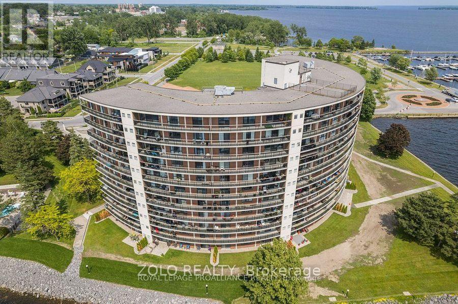 Experience refined waterfront living in this exceptional 1,380 sq. ft. condominium overlooking the Bay of Quinte, Bay Bridge, Meyers Pier, and the marina. Designed for discerning professionals, this residence blends modern luxury, low-maintenance living, and inspiring views-all just steps from downtown Belleville's best restaurants, boutiques, and theatres.The spacious open-concept layout is ideal for both entertaining and everyday comfort, featuring a stunning 40-foot wraparound balcony accessible from the living room and primary suite-perfect for morning coffee or unwinding after a busy day.The gourmet kitchen impresses with elegant custom cabinetry, gleaming granite countertops, seamlessly flowing into the bright living and dining areas. The primary suite offers balcony access, a generous walk-in closet, and a spa-inspired ensuite bath. A versatile second bedroom or office provides flexibility for guests or remote work. Enjoy exclusive, resort-style amenities tailored for an upscale lifestyle: 24/7 concierge and security, a heated saltwater pool, sauna, fully equipped fitness center, party/meeting rooms, library/games room, and tennis court. Private storage ensures convenience and peace of mind. The HVAC system was replaced in 2024 to further put at ease there will be no costly repairs in the foreseeable future. Perfectly located near the waterfront trails of Janet Forrester Park, close to the hospital and three marinas, this address delivers the ultimate in balance-professional polish meets relaxed coastal living. Whether entertaining clients, hosting friends, or simply enjoying the sunset from your balcony, this luxury condo redefines the art of living well. (id:6289)