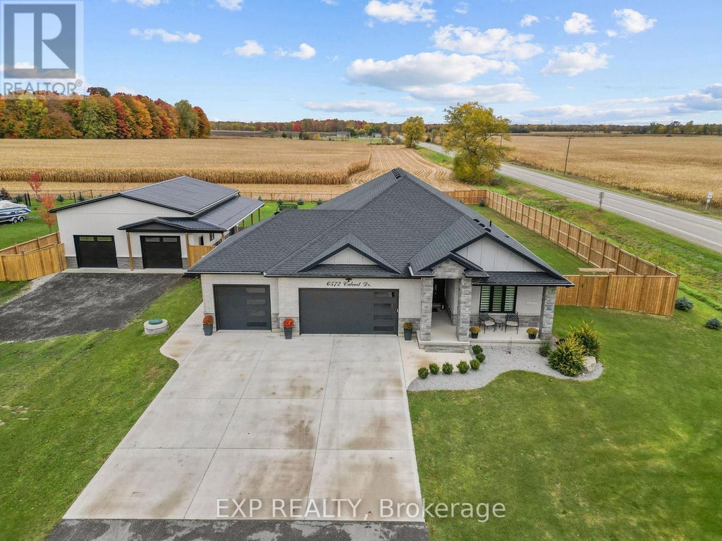 Set on an almost three-quarter acre lot just minutes from Strathroy, this remarkable property showcases a brand new 30x40 ft heated and air-conditioned shop with 13-foot ceilings, a large covered patio, matching house siding, and a steel roof designed for lasting durability. Built beside the home to connect seamlessly with the massive concrete patio, it creates a functional outdoor living space perfect for entertaining, relaxing, or watching sunsets over the open fields that provide full privacy through the summer and fall. The property is fully fenced with privacy trees already planted, features a gas line for the barbecue, and offers both a covered front and back porch for year-round enjoyment. Inside, the home combines craftsmanship and comfort with 10-foot ceilings in the entry, a vaulted living room anchored by a stone gas fireplace, and engineered hardwood throughout. The kitchen includes a quartz backsplash, pot filler, extra large island, and wine fridge, while transom windows, 9-foot bedroom ceilings, and a tray ceiling in the primary suite add architectural character. The primary wing features a luxurious ensuite with a soaker tub and a spacious walk-in closet, privately tucked away from the main living areas. The oversized three-car heated garage is equipped with a gas heater, and the basement offers exceptional versatility with two large bedrooms, a full bath, rough-in for a bar or second kitchen, and a conduit for a projector. Additional details include a generator hook-up, exterior security camera system, soffit outlets for Christmas lights, and a large mudroom with custom built-ins, quartz bench top, and kick-close drawers. The home runs on natural gas and well water with a reverse osmosis system, and Bell Fibe Internet and TV provide modern connectivity. Located on a country road with a dead-end street nearby for walking and biking, this home is only five minutes to Strathroy and thirty minutes to London. (id:6289)